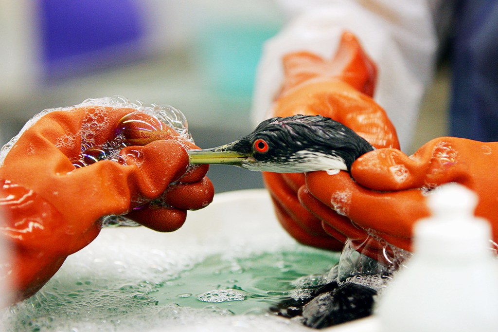 Voluntarios lavan a un ave afectada por un derrame de petróleo.