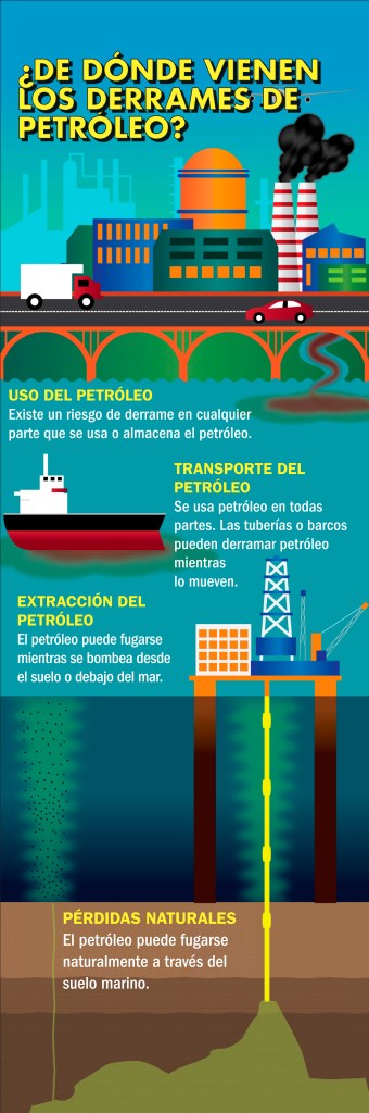 Se puede encontrar petróleo debajo del suelo marino. Máquinas perforan debajo del océano. Luego, se bombea el petróleo. Esto se llama extracción. Es una manera en que el petróleo puede fugarse accidentalmente. Los derrames de petróleo pueden también ser causados por el transporte o por mover el petróleo. (Lee “¿De dónde vienen los derrames de petróleo?”).