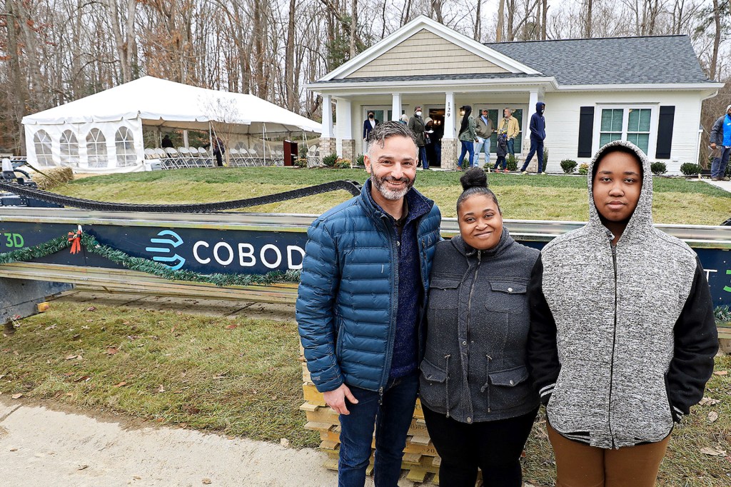 Zachary Mannheimer (izq.) empezó Alquist 3D. Él posa con una familia enfrente de su nueva casa por impresión en 3D.