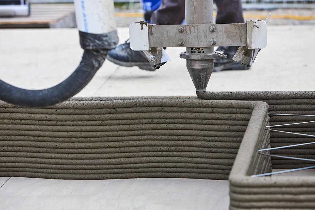 Un trabajador mira como una impresora 3D de Alquist vierte cemento. Las capas aumentan para formar una pared.