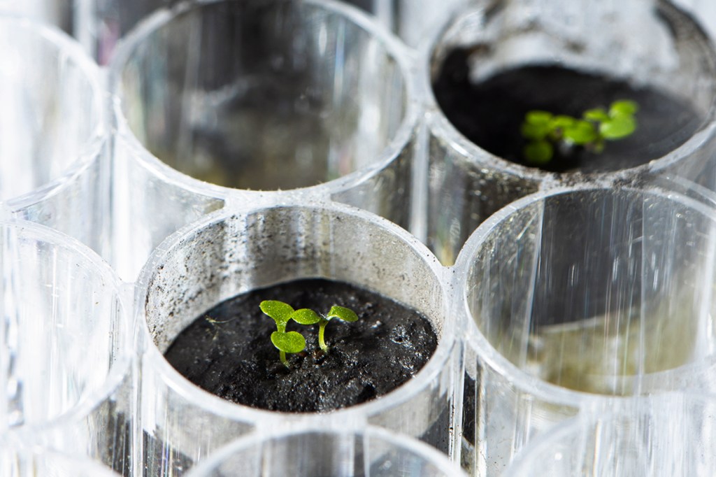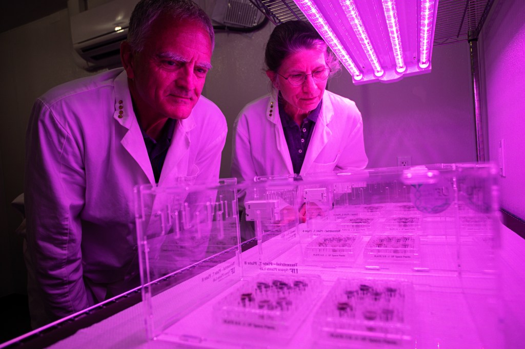 TYLER JONES—UF/IFASLos científicos colocaron la tierra en tazas pequeñas. Cada taza tenía alrededor de una cucharita de tierra lunar. Otras tazas recibieron tierra de la Tierra. Los científicos plantaron semillas. Ellos regaron la tierra. Ellos colocaron las tazas debajo de luces de crecimiento.
