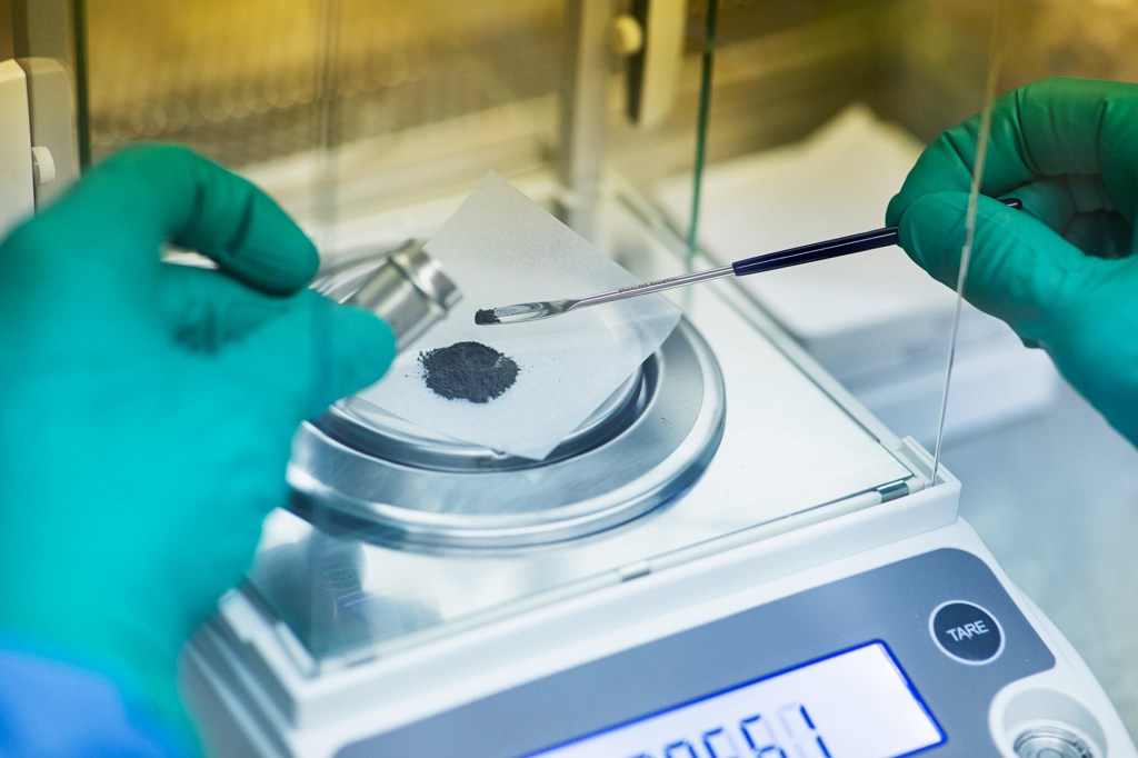 Un científico pesa una muestra de tierra lunar. Se plantarán y se regarán las semillas en esta.