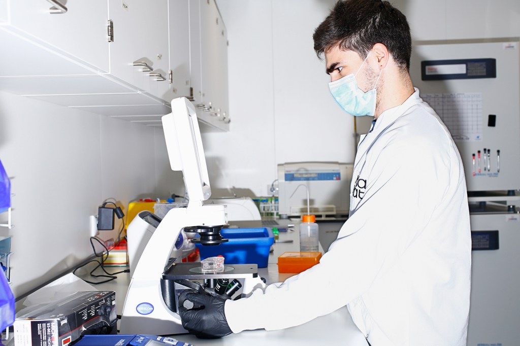 EN EL LABORATORIO Un científico en Mosa Meat mira muestras de células con un microscopio.