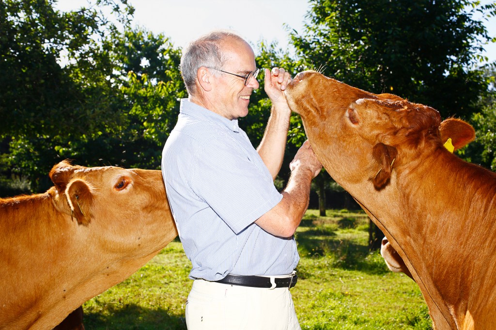 ON THE FARM Mark Post, of Mosa Meat, greets Limousin cows on a farm in the Netherlands.