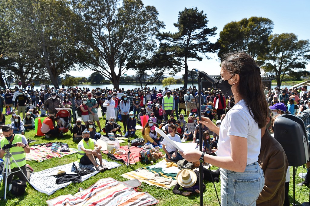 TAKING A STAND Mina speaks to people at the rally in Berkeley, California, in March 2021.