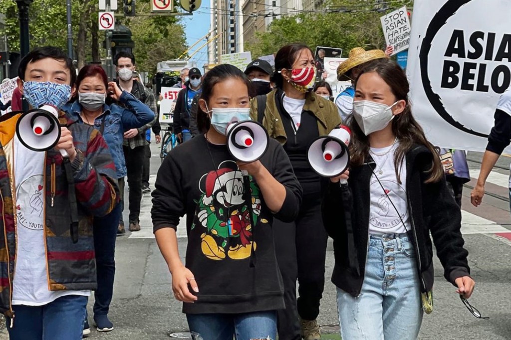 LOUD AND CLEAR From left, Cooper Hong, Cam-Ly Nguyen, and Mina march at a rally in San Francisco in May 2021.