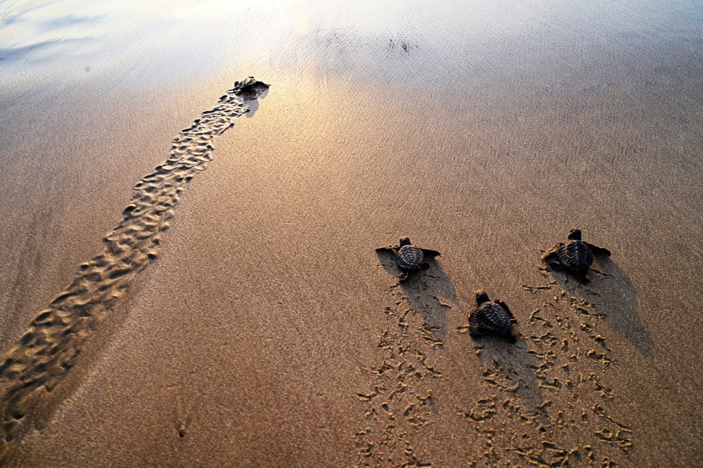 Baby sea turtles head toward the Indian Ocean, in Indonesia, on February 21. There are seven sea-turtle species. Some are endangered. People in Indonesia are wo…
