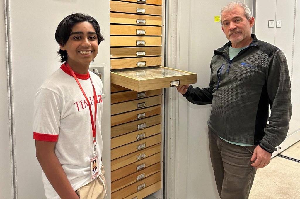 Brian Fisher le da al Niño Reportero de TFK, Dylan Patel, un recorrido por la Academia de Ciencias de California, en San Francisco, en abril de 2024.