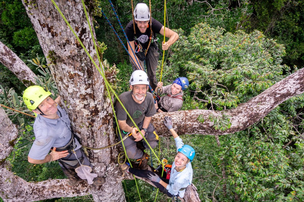 En 2022, Fisher (centro) enseña a los estudiantes de Madagascar a trepar a los árboles para recolectar hormigas para el estudio.