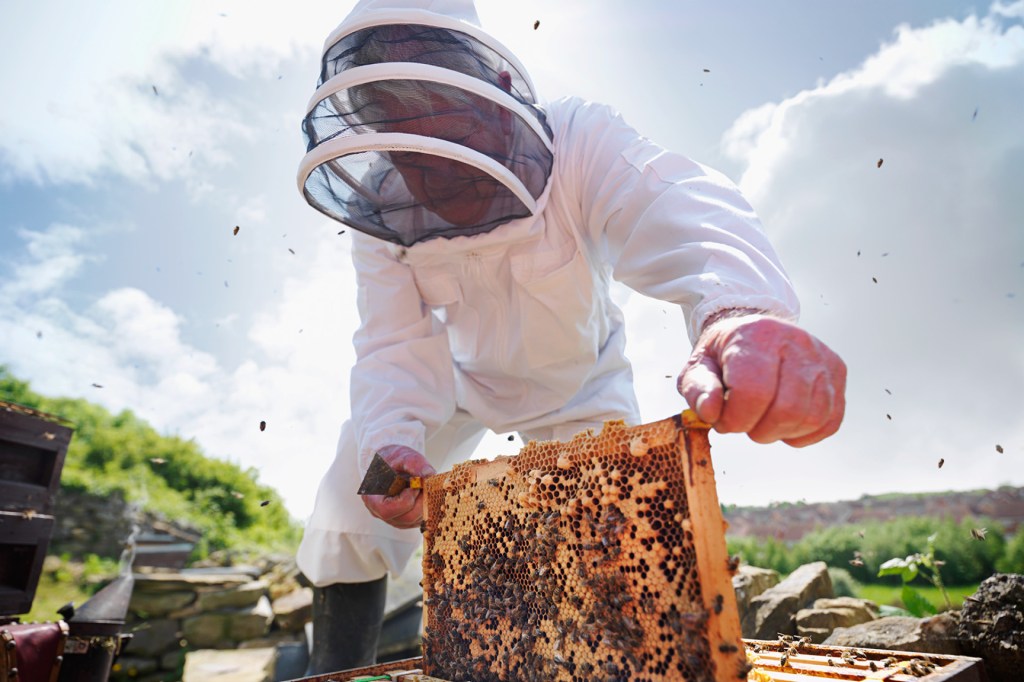 Un apicultor está revisando una colmena. Un apicultor depende de las abejas para hacer miel. Las abejas también se utilizan para polinizar los cultivos.