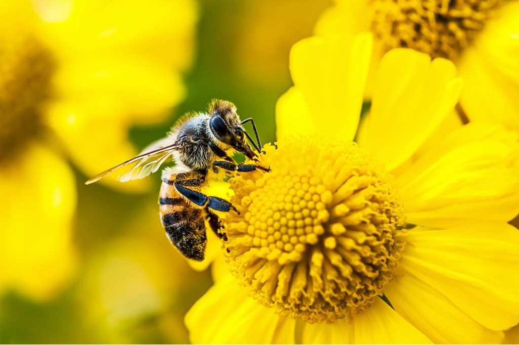 Una abeja obtiene néctar de una flor. El polen de la flor se adhiere a la abeja. La abeja lo lleva a otra flor. Esto se llama polinización.