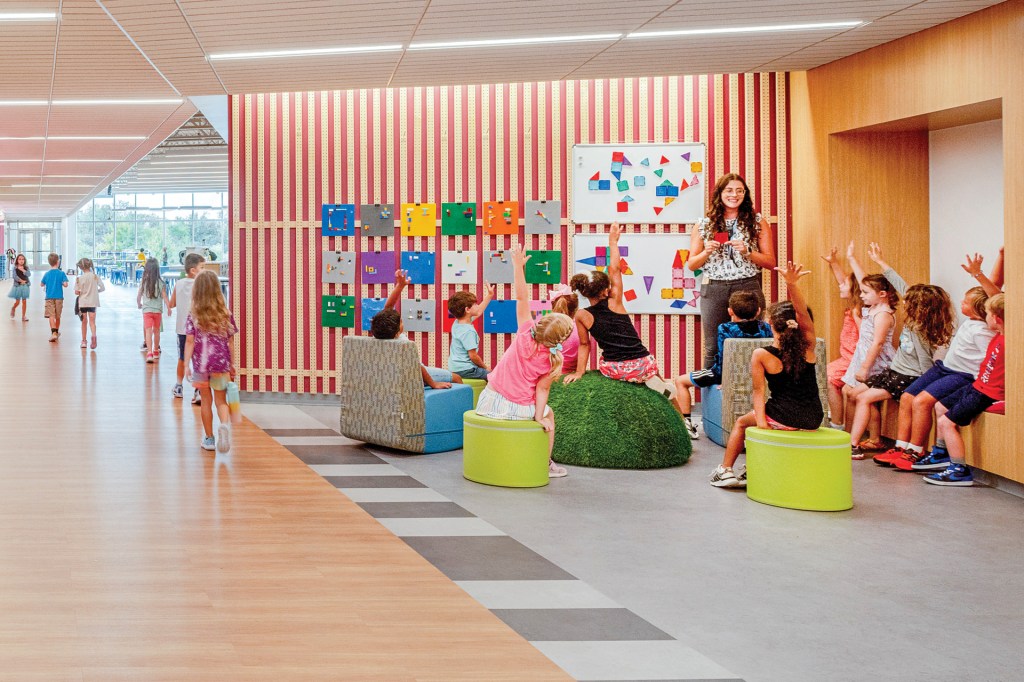 COURTESY ANNE FULLENKAMPEl resultado es una escuela con la emoción de un museo para niños. Hay patrones matemáticos en el piso. Hay mapas magnéticos en las paredes. Ryan Bonicky enseña en la escuela. “Hay definitivamente un revuelo en todas partes”, dice. “Los niños están entusiasmados”.