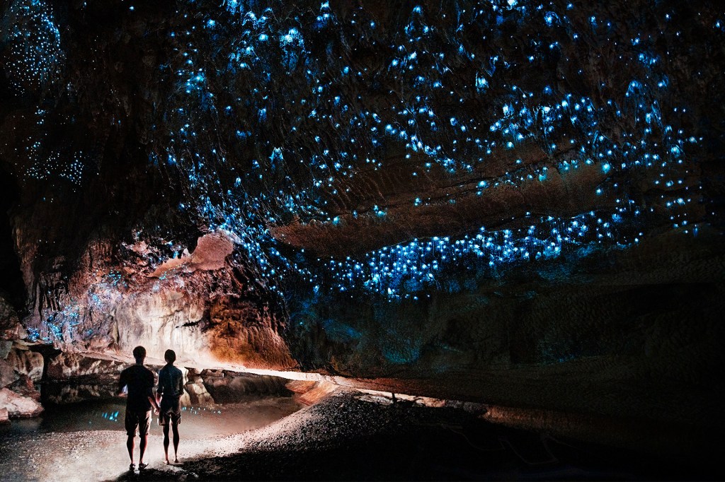Glowworms are bioluminescent. This means they make their own light. See the blue lights above? Those are glowworms.