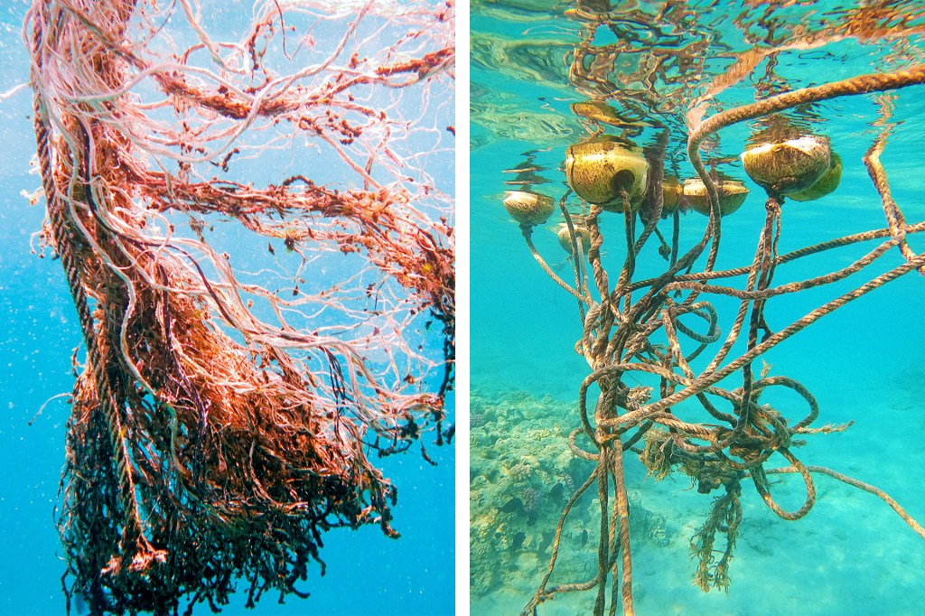 La red de pesca enredada (izquierda) y la cuerda anudada (derecha) flotan en el océano. Las ballenas pueden confundir ambas con comida.