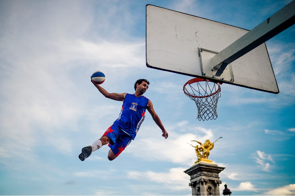 Un jugador de baloncesto salta para hacer una clavada en el Día de los Juegos Olímpicos de París, en 2018. El evento celebró los próximos juegos de 2024.