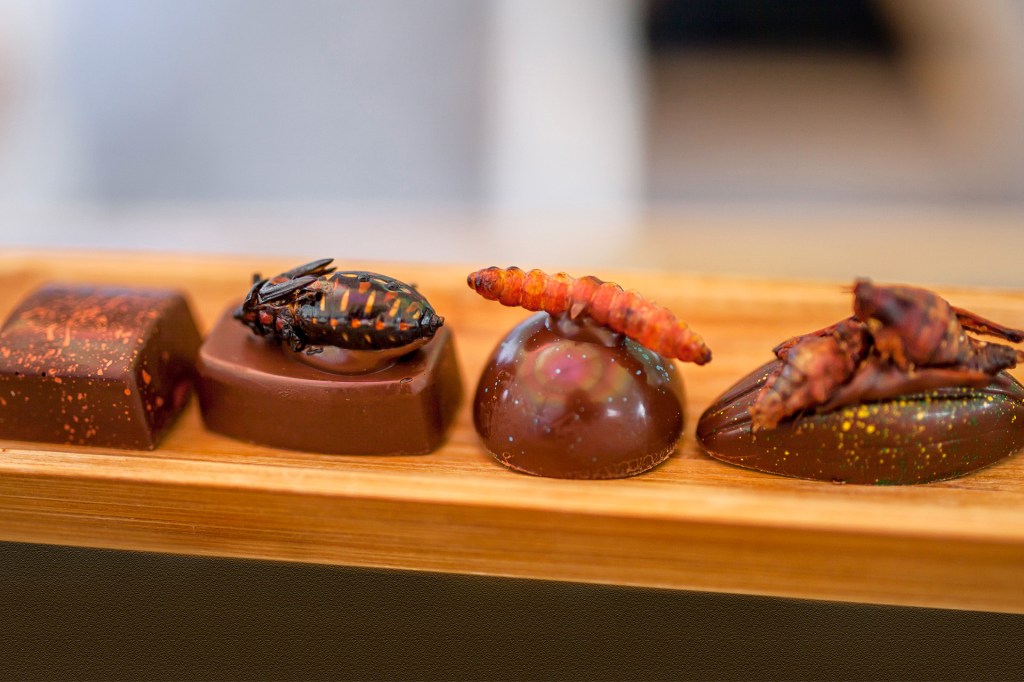 These chocolates are topped with insects. The insects are toasted or fried for an extra crunch.