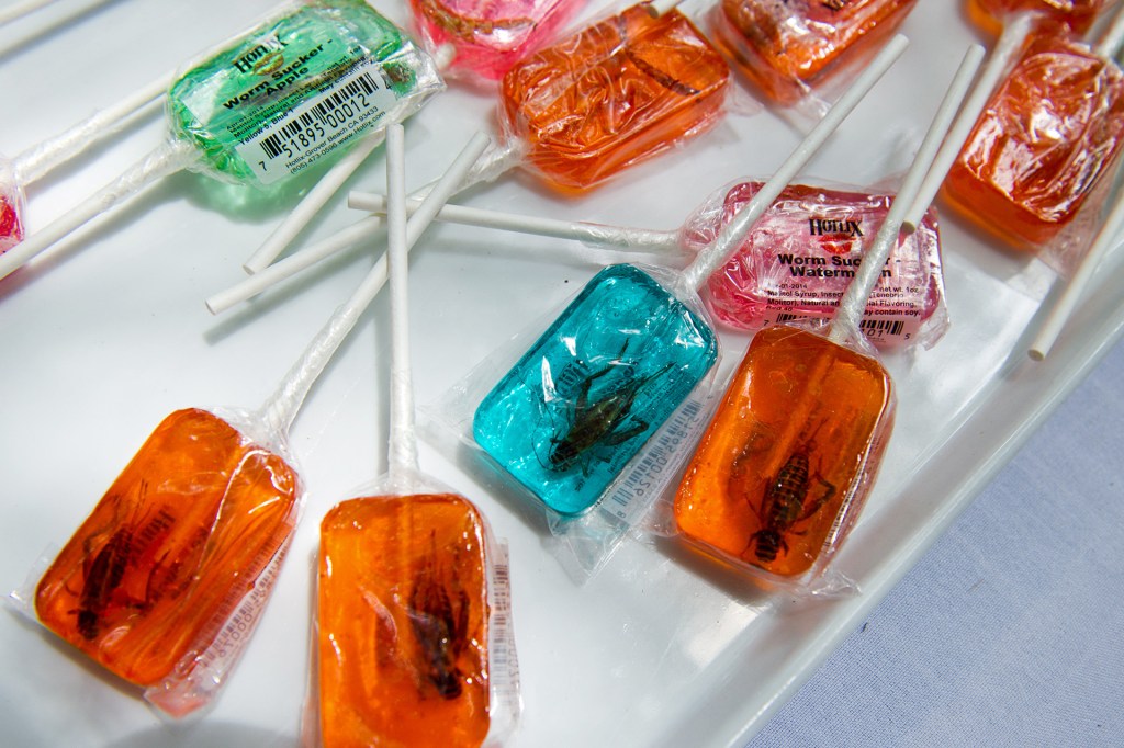 These lollipops have a surprise inside. They contain edible insects, such as crickets.
