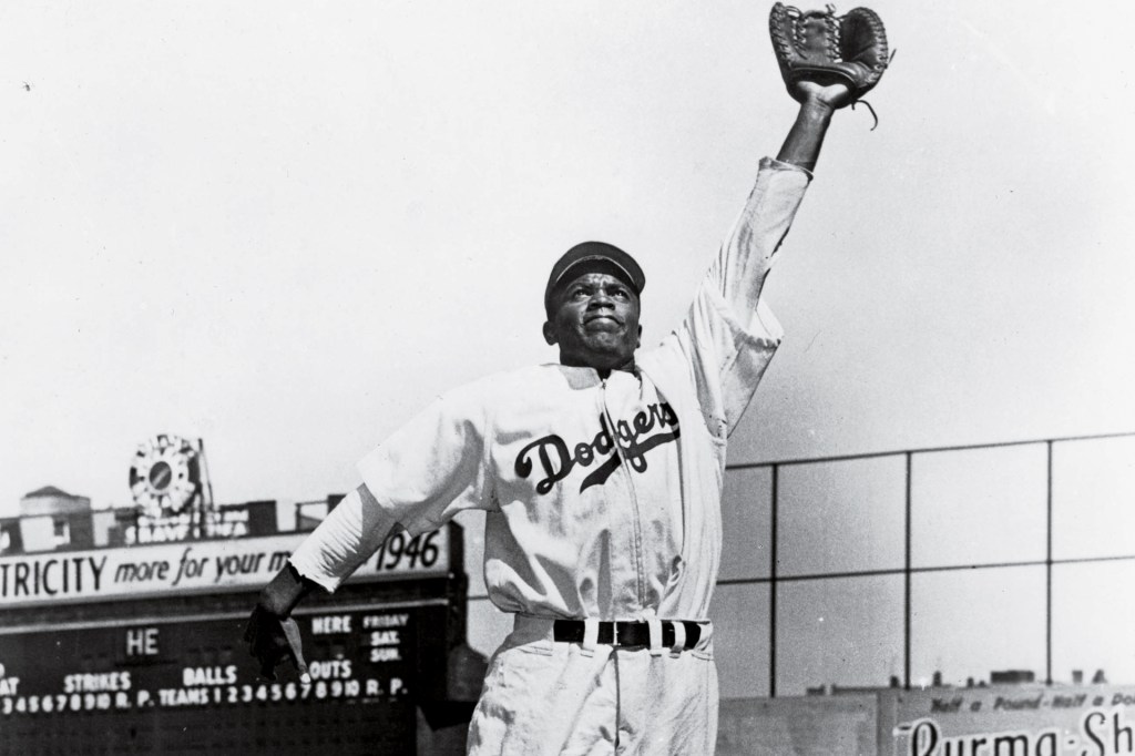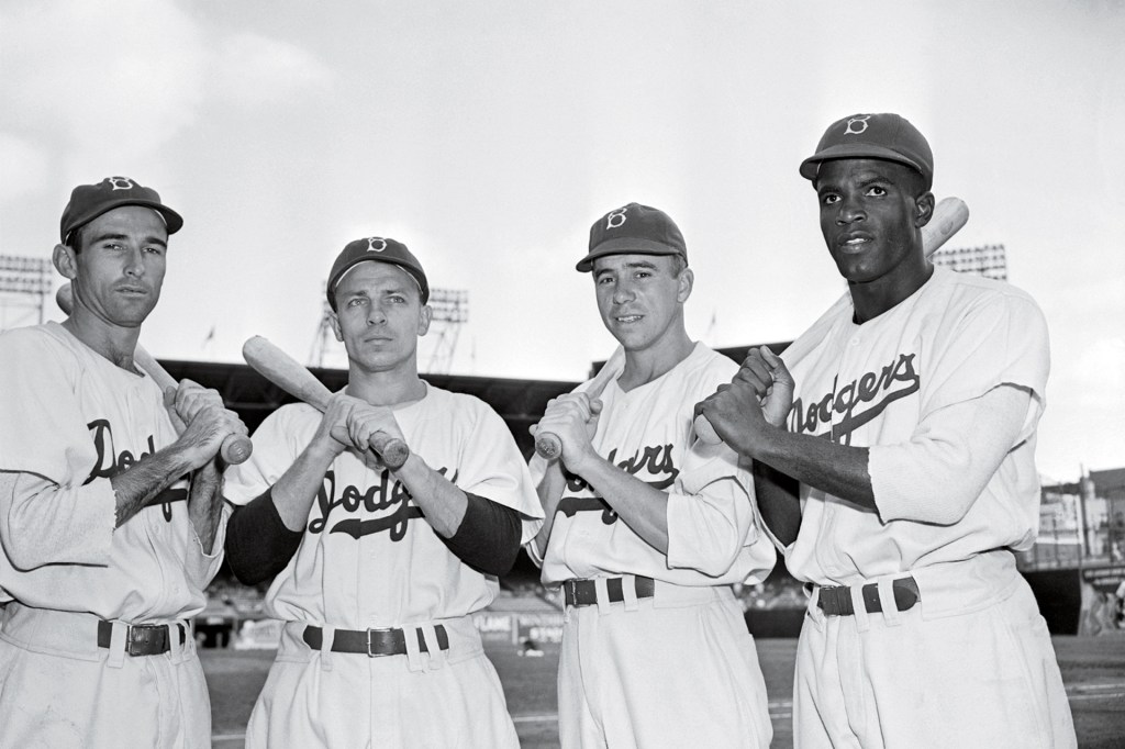 Robinson poses with fellow members of the Brooklyn Dodgers in 1947. He was the first Black athlete to play modern MLB.