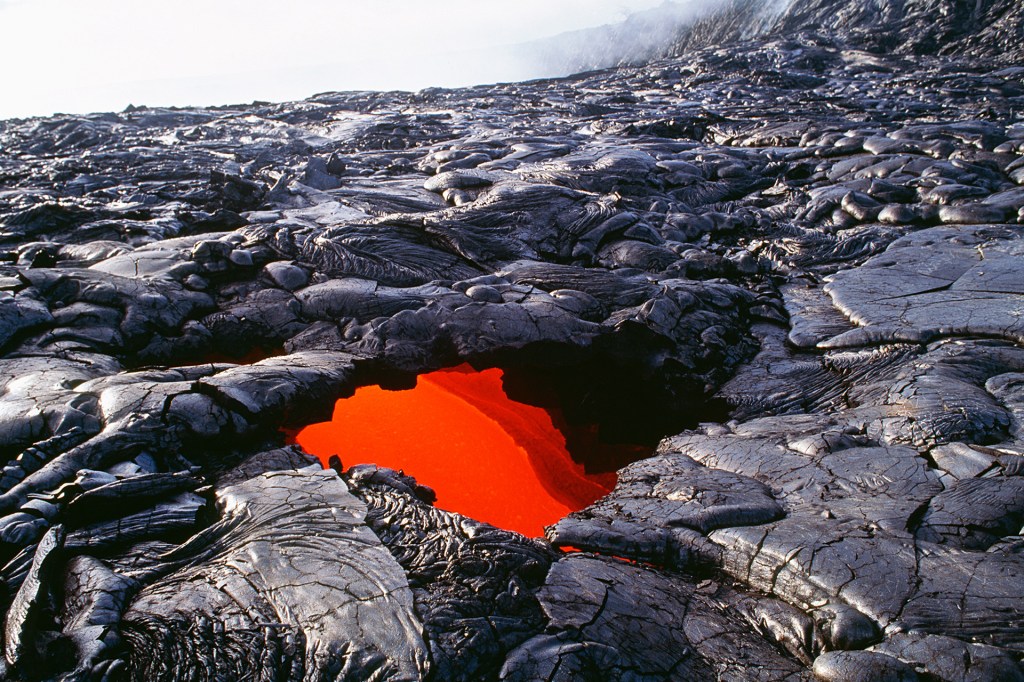 Many of Hawaii’s caves are lava tubes. After a volcano erupts, hot lava flows. The surface of the lava hardens and turns to rock. But underneath, it keeps flowing. As it moves away, an empty tube or cave is left behind.