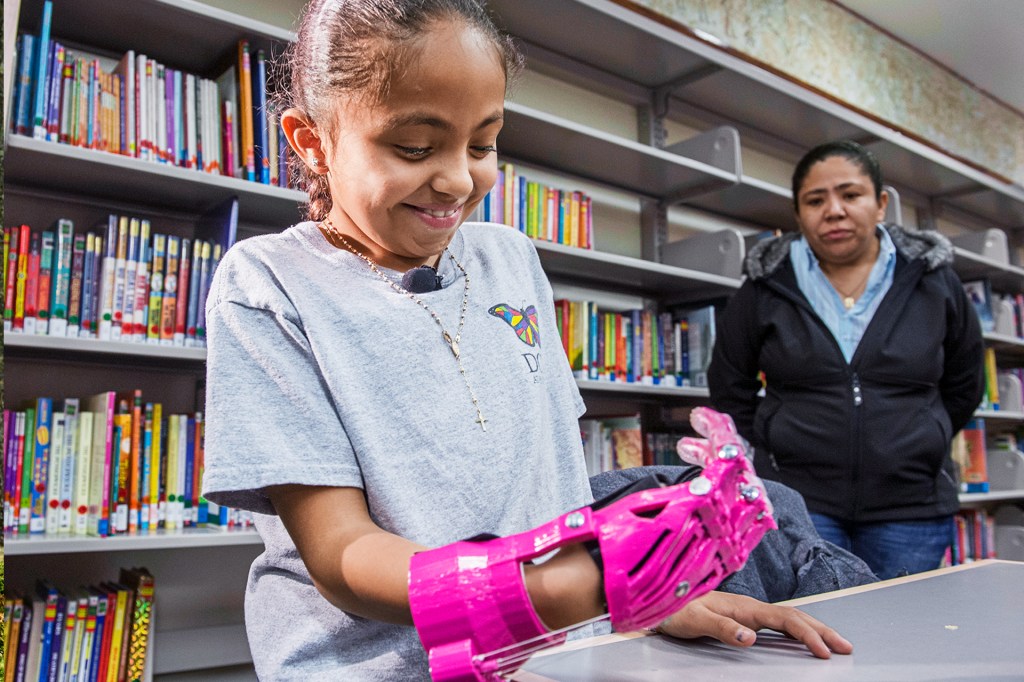 A girl puts on her new 3D-printed hand. It was made for her by an engineer. He used a design that was posted online for anyone to use.