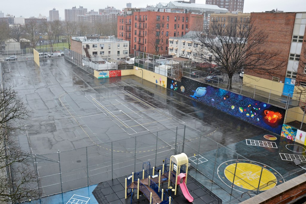 This playground in the Bronx, in New York City, has an asphalt play space. Before its redesign, it trapped heat.