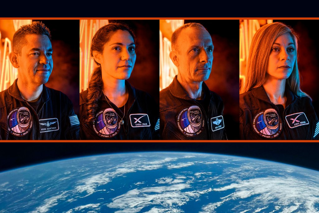 Jared Isaacman, comandante de la misión, Sarah Gillis, especialista en misiones, Scott Poteet, piloto de la misión, Anna Menon, oficial médica