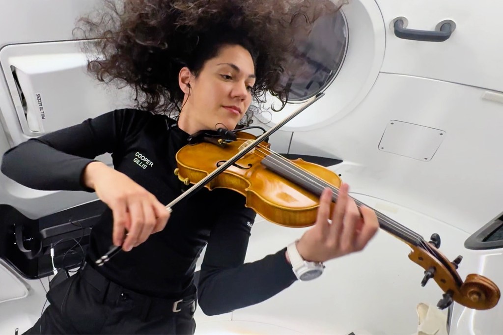 La especialista en misiones, Sarah Gillis, toca el violín en el espacio.