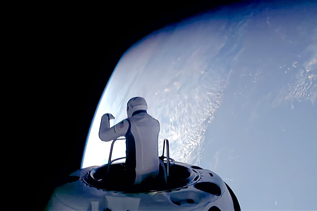 El comandante de la misión, Jared Isaacman, asoma la cabeza al espacio el 12 de septiembre.