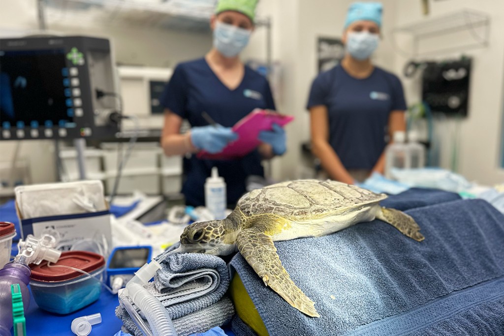 En el Centro de Cuidado de Tortugas Marinas, Buschiazzo trabaja con veterinarios. Ella ayuda con las cirugías. Prepara comidas para las tortugas. Hace lo que sea necesario para ayudar a las tortugas a recuperarse.