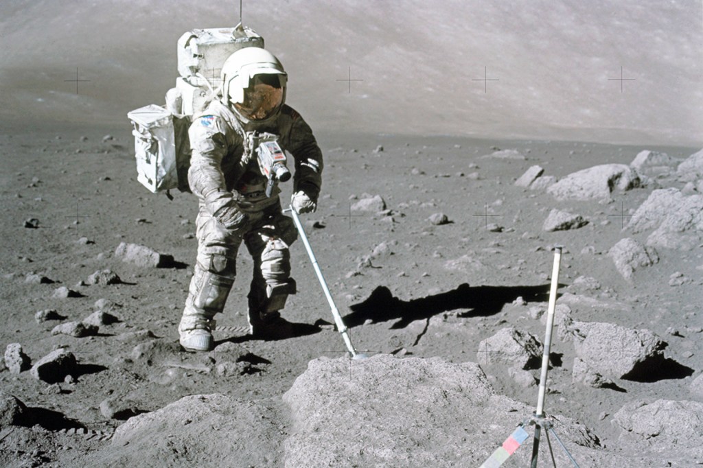 Astronaut Harrison Schmitt gathers soil on the moon during the Apollo 17 mission, in 1972.