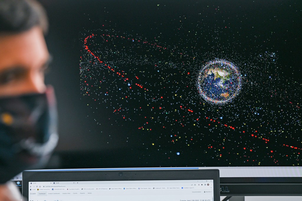 Un monitor de la Agencia Espacial Europea muestra escombros flotando en la órbita de la Tierra.