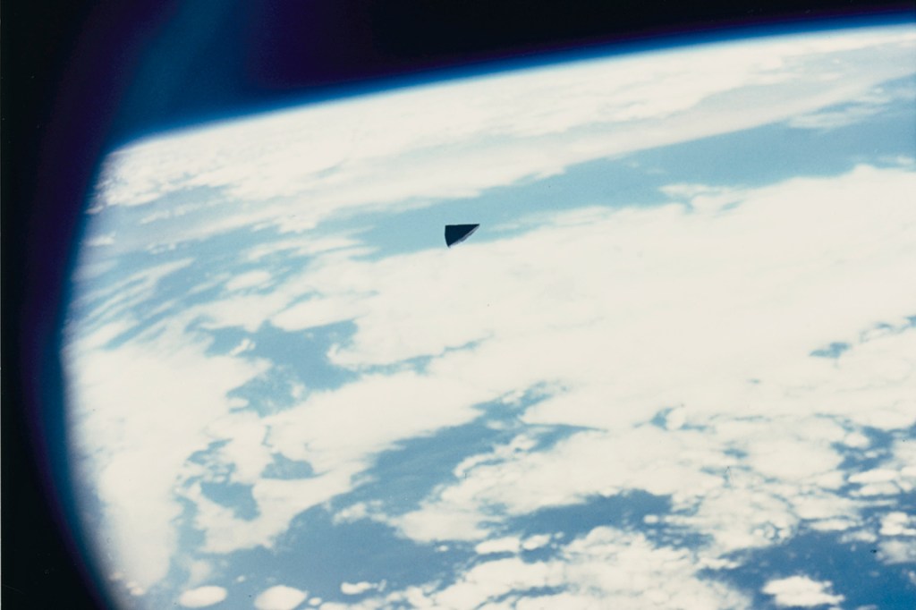 Un pedazo de escombros navega alto sobre la Tierra. Fue visto desde el transbordador espacial Columbia en 1986.