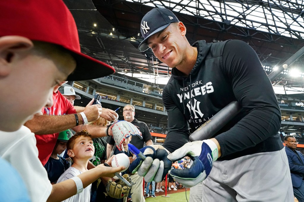 Judge firma autógrafos antes de un partido contra los Texas Rangers el 3 de octubre.