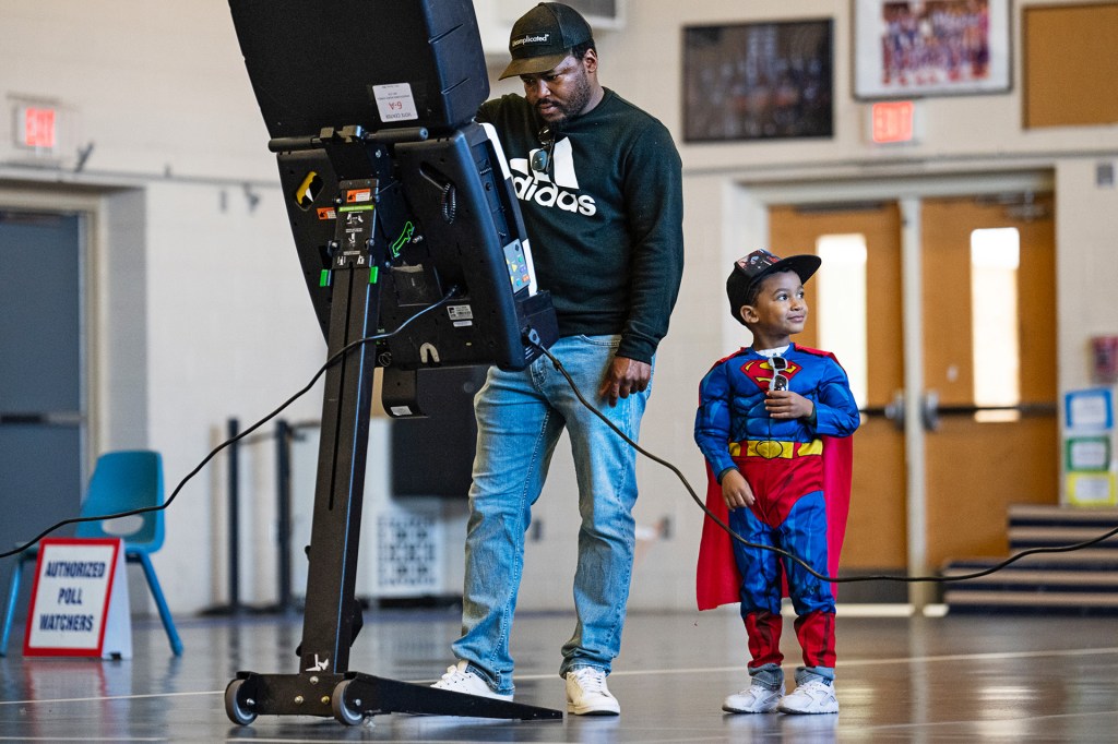 Un votante y su hijo van a un centro de votación el día de las elecciones en Washington, D.C.
