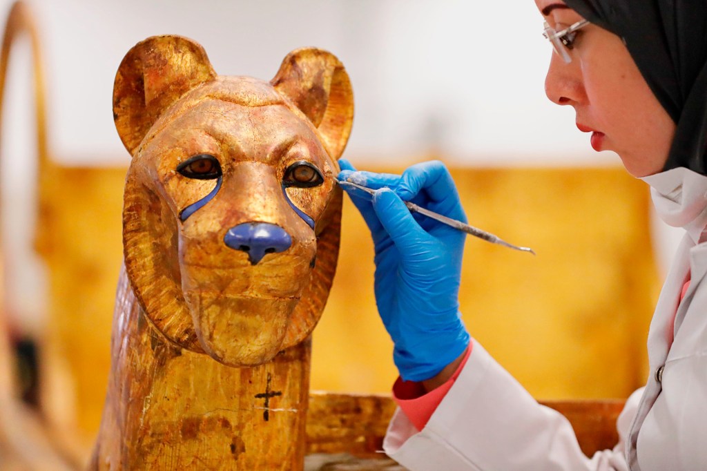 LIMPIEZA Un conservador restaura el trono del Rey Tut en el Gran Museo Egipcio.