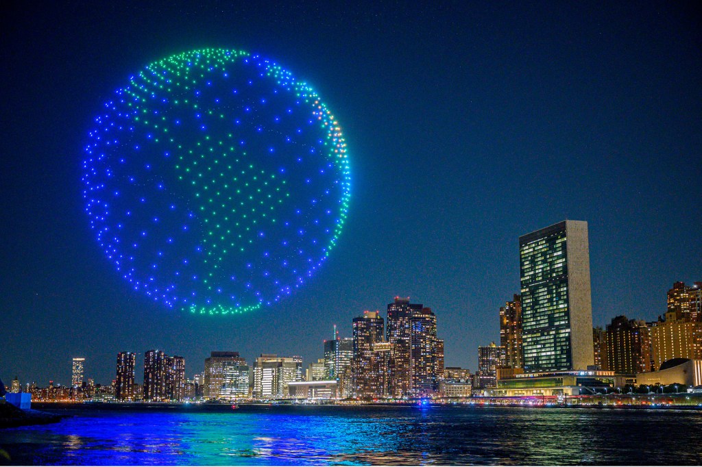 A drone display brightens the night sky outside the United Nations headquarters, in New York City, on September 15. It was set up by protesters trying to raise …