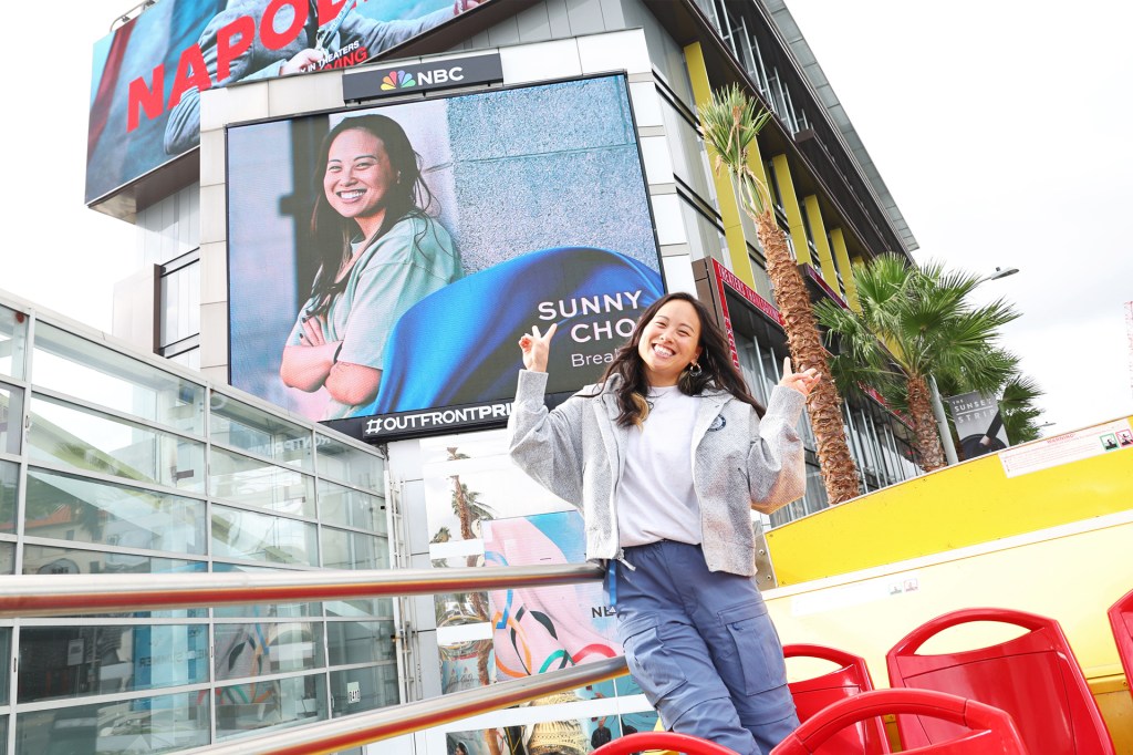 VER DOBLE Choi se ve a sí misma en una valla publicitaria de Los Angeles mientras está en la gira en autobús Camino a París del equipo de EE.UU., en 2023.