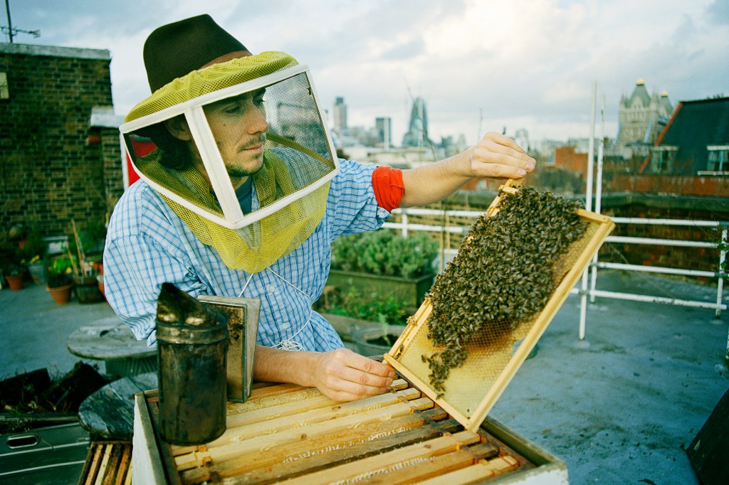 BIG-CITY BUZZ An urban beekeeper manages a swarm of honeybees on a rooftop in a bustling city.