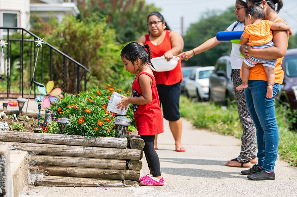 DO YOUR PART A family waters flowers in front of their home. Even small flower patches can boost biodiversity.