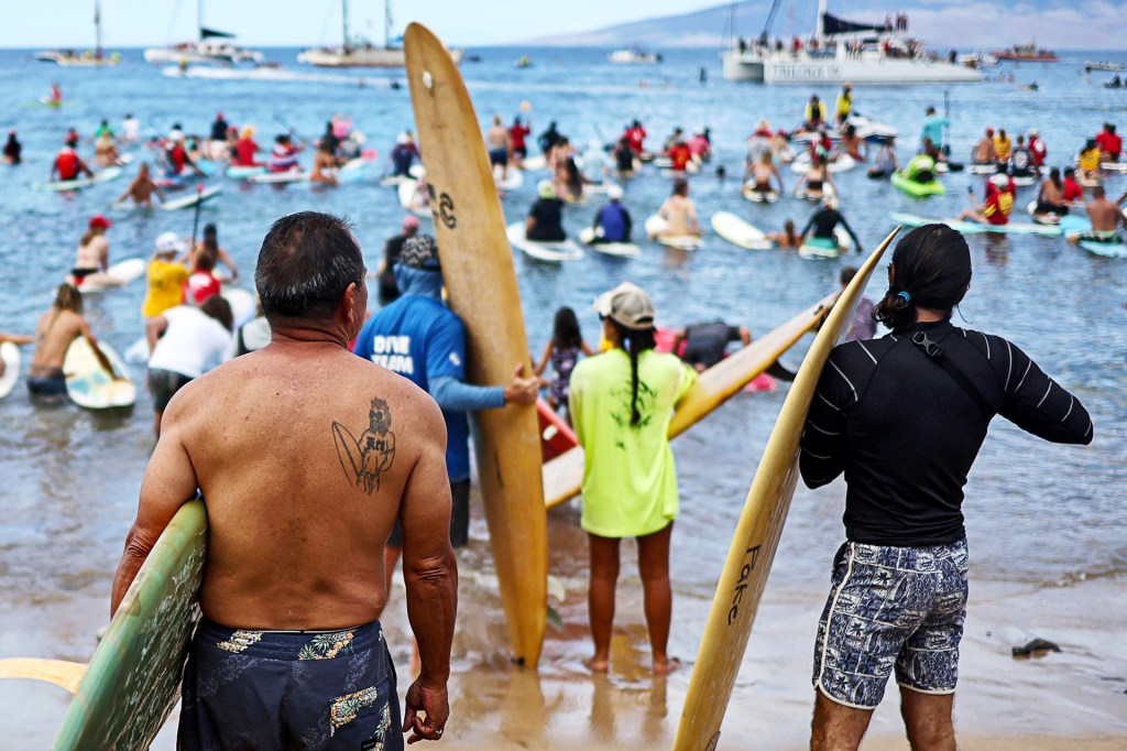 JOIN IN At a Lahaina beach, on August 8, people join a paddleboarding event to mark the one-year anniversary of the fires.