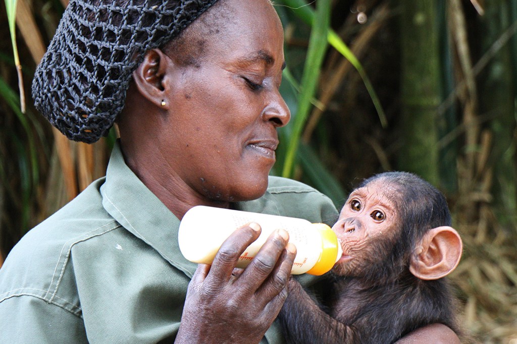 BACK TO HEALTH Caregiver Antonette nurses an orphaned chimpanzee named JeJe.*