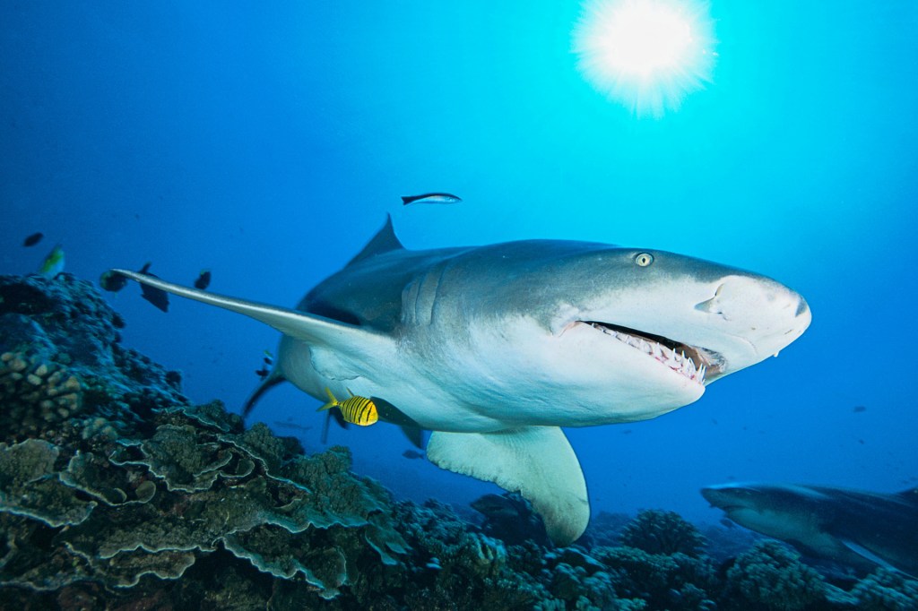 MANTENER EL EQUILIBRIO Los tiburones y los animales de los que se alimentan son parte del ecosistema saludable alrededor de un arrecife de coral.
