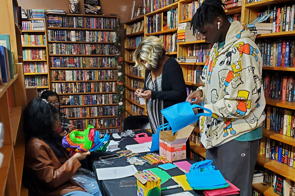 PAQUETES DE POSITIVIDAD En diciembre de 2023, Lena y otros voluntarios preparan 150 bolsas de positividad en la tienda Book Worm.