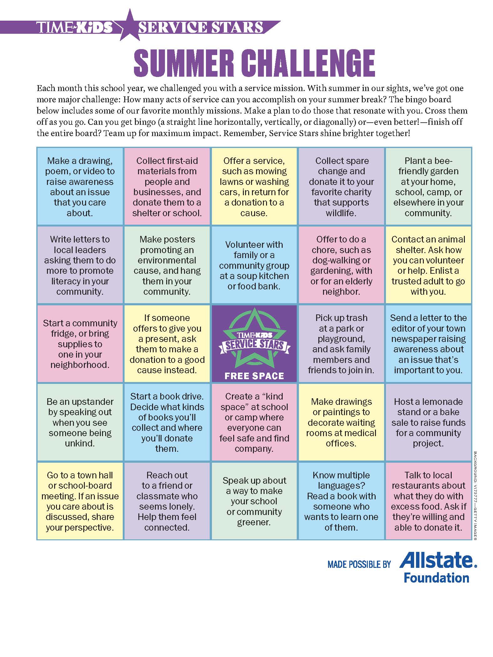 With summer in our sights, we’ve got a challenge for students: How many acts of service can you accomplish on your summer break? This bingo board includes some of our favorite missions. Make a plan to do those that resonate with you. Cross them off as you go. Can you get bingo (a straight line horizontally, vertically, or diagonally) or—even better!—finish off the entire board? Team up for maximum impact. Remember, Service Stars shine brighter together!