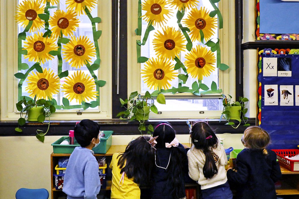 BRIGHT HOPES Handmade sunflowers decorate an elementary school window in Chicago, Illinois, on March 3.