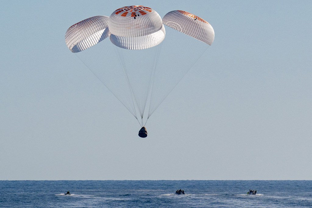 SAFE LANDING The SpaceX capsule parachutes into the ocean on March 18.