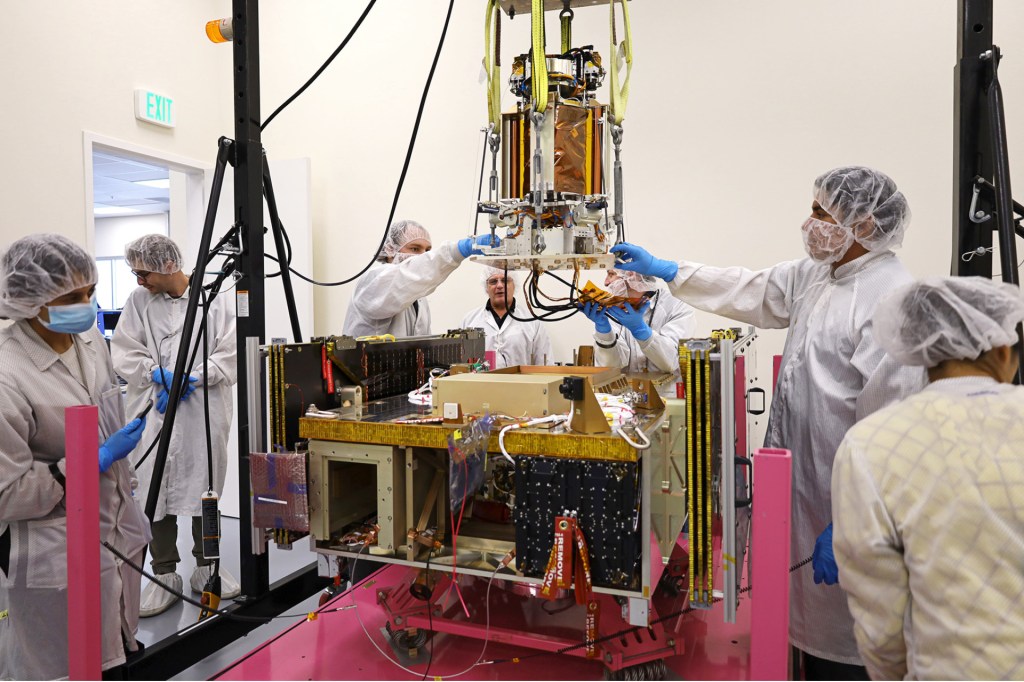 PIECE BY PIECE Caltech scientists assemble the spacecraft before sending it into space.