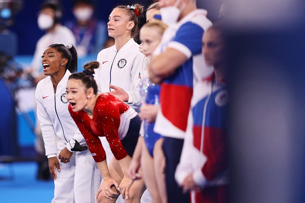 LET'S GO! Biles, Suni Lee, and others cheer on Team U.S.A. from the sidelines.