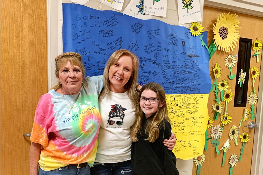 I’m in the fifth grade at Pevely Elementary School, in Pevely, Missouri. Our art teacher, Arina McAllister (center), is from Ukraine. Her country is going through a terrible war. In Ukraine, sunflowers represent peace. To us, they also mean support, love, and faith. My grandma Mona Asinger (left) works in the school cafeteria. It was her idea to shower Mrs. McAllister with sunflowers. Every student drew or colored sunflowers to hang. It was beautiful to see Mrs. McAllister’s face when she saw her hallway walls covered in them! You could tell she loved it. She even cried. Being away from family and friends is hard. Knowing the dangers they face is even harder. Fortunately, Mrs. McAllister’s husband, children, and parents are here with her. And we are, too. —By Alayna Asinger, 10