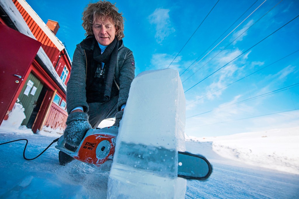 ICE SCULPTOR Terje Isungset uses ice from local lakes to make musical instruments. A chain saw helps.